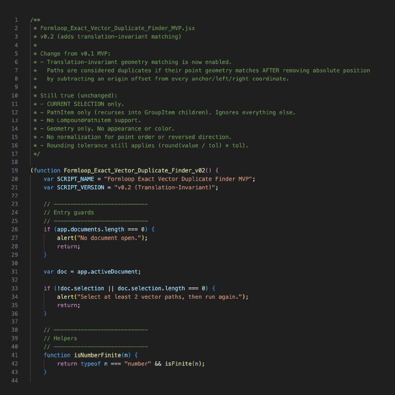 Finds exact duplicate vector paths in your current selection by comparing true path geometry. In v0.2, position is ignored. Two identical shapes in different locations can match.